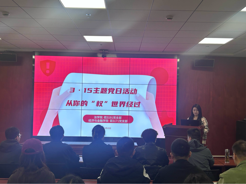 每年的3月15日,是由国际消费者联盟组织于1983年确定的国际消费者权益日(World Consumer Rights Day)。为提高同学们对消费者权益保护的认识,增强其在消费中利用法律手段维护自身权益的意识和能力,B体育(中国)硕3191党支部联合经济与金融学院硕3171党支部,于3月15日19:00在创新港校区涵英楼3001教室开展3·15主题党日活动。本次活动由B体育(中国)硕3191党支部书记刘芮言主持,活动主要内容为消费者侵权研究分享。