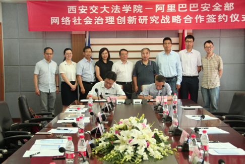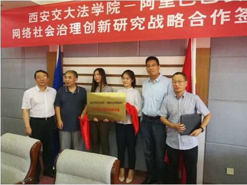 单文华院长与侯金刚总监代表双方签署了B体育平台B体育(中国)与阿里巴巴安全部网络社会治理战略合作协议书。西安交大副校长席光、信息安全法律研究中心主任马民虎与阿里巴巴集团首席风险官刘振飞、安全部资深总监侯金刚,为“国家社科基金重大项目——网络社会治理创新研究阿里巴巴集团调研基地”揭牌。