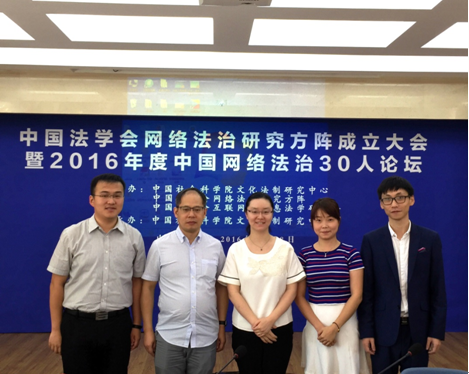 2016年8月28日,中国法学会网络法治研究方阵举行成立大会暨2016年度中国网络法治30人论坛。西安交大信息安全法律研究中心成功入选中国法学会“网络法治研究方阵”理事单位,成为全国五家理事单位之一。校社科处处长贾毅华、学院丁卫副院长受邀参加成立大会并致辞,信息安全法律研究中心副主任王玥副教授带领研究团队成员博士生马宁、党家玉参加论坛。开幕式由中国社科院文化法制研究中心主任、中国法学会互联网与信息法学会副会长周汉华主持。中国法学会研究部主任李仕春、中国法学会副会长李林、中国信息通信研究院政策与经济研究所所长鲁春丛、中南大学B体育(中国)院长陈云良、B体育平台社科处处长贾毅华、华东政法大学刑事司B体育(中国)副院长王永全分别作为方阵理事单位代表致辞。
