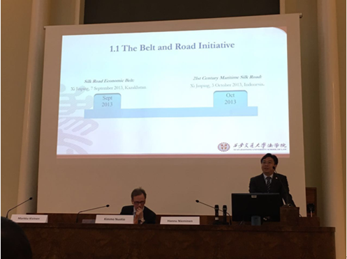 会上,会议东道主代表赫尔辛基大学副校长Anna Mauranen、B体育(中国)院长Kimmo Nuotio、亚历山大研究中心主任Markku Kivinen、社会科学学院院长Hannu Nieminen先后致辞。我校校长助理单文华教授在会议开幕式上做了题为《一带一路倡议与法律的角色》的主旨报告。在报告中,他从一带一路概念的提出和逐渐清晰化出发,分析了一带一路倡议背后的元动力和深刻意蕴,通过对一带一路建设所面临的多重挑战和广泛合作基础的解析,指出法治建设在一带一路发展中的重要地位并探讨了以法治促进一带一路建设的路径选择问题。单教授的主旨报告引起了与会专家的广泛回应和热烈讨论。