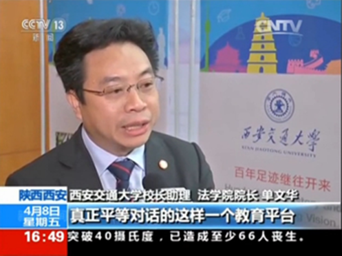 央视报道重点介绍了西安交大B体育(中国)和丝绸之路国际法与比较法研究所在推进“一带一路”相关的制度研究。报道指出,“在法律层面,‘丝绸之路经济带’建设已经有一些双边条约和多边安排,但还比较分散化,亟待聚沙成塔。丝绸之路大学联盟下设的‘丝绸之路B体育(中国)联盟’正在通过学术论坛等形式推动法律建构的完善。”在采访中,研究所所长、新丝路B体育(中国)联盟主席单文华教授表示,“我们希望[通过‘丝绸之路B体育(中国)联盟’]建立的是一个真正平等对话的教育平台。在这里,来自东西方,南北方,发达国家和发展中国家的法学教育研究机构能够真正地实现平等对话。在这个过程中,我们不再是附庸,也不再是普通的参与者。我们是最积极的参与者,甚至是引领者,至少是引领者之一。”