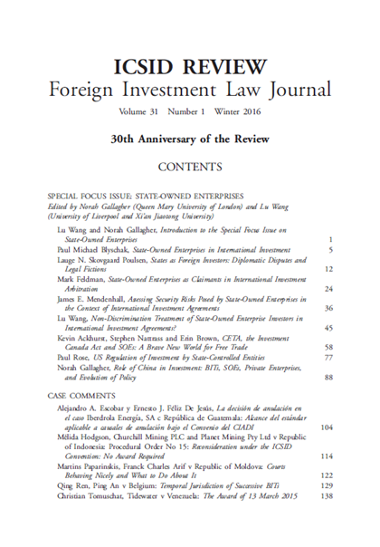 近日,国际投资法领域顶级专业期刊ICSID Review—Foreign Investment Law Journal(《国际投资争端解决中心评论——外国投资法学刊》)三十周年纪念期刊第一期正式出版,西安交大B体育(中国)博士生王璐作为特邀编辑(Guest Editor)主编了本期特别专栏“国有企业专题研究”(Special Focus Issue on State-Owned Enterprises),并发表论文 “Non-Discrimination Treatment of State-Owned Enterprise Investors in International Investment Agreements?”(国际投资协定中国有企业投资者的非歧视待遇?)。