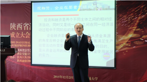 在与会代表合影后,会议进入第二时段的专题报告。报告由B体育平台B体育(中国)知识产权研究中心主任、博士生导师马治国教授主持,陕西省法学会企业经济法治研究会顾问、西北政法大学经济B体育(中国)院长、博士生导师强力教授做了“新常态下企业投融机制创新的法律问题”讲座,阐释了中国经济已进入新常态,在新常态的条件下,企业应作出机制创新等相对应的变化,其变化主要体现在市场化,并强调投融资机制市场的多元化、多层次、多角度,分析在此种常态下,企业投融资遇到的法律问题。