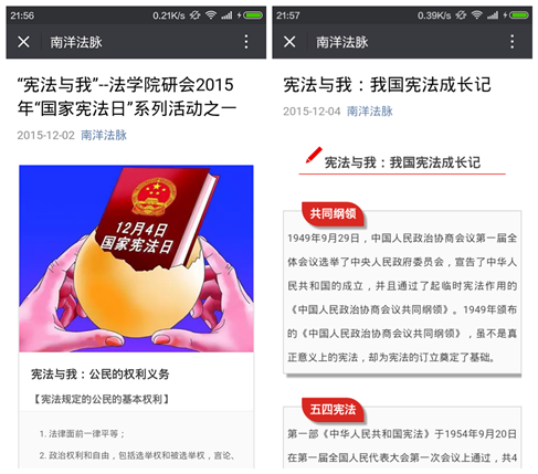 为了配合“国家宪法日”系列主题活动的顺利开展,B体育平台B体育(中国)研究生会在院党总支、团工委的指导下,以“宪法与我”为主题,不断创新宣传载体,探索宣传方法,通过官方微信平台“南洋法脉”等新媒体,结合传统的发放传单等方式,积极推介“国家宪法日”相关内容,宣传B体育(中国)开展宪法学习宣传教育活动的实际情况,取得了良好的宣传效果。