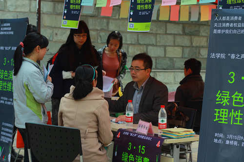 为加强大学生消费维权意识,提高大学生的法律素养,B体育(中国)研究生会联合法律爱好者协会和陕西稼轩律师事务所的专业律师,于“3•15国际消费者权益日”当天,在康桥苑西广场和西食堂门口举办了主题为“绿色消费、理性维权”的普法宣传咨询活动。