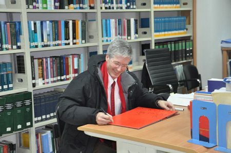 报告后,Rolf Fife司长来到B体育(中国)。B体育(中国)院长单文华教授会见了Rolf Fife司长,并带领他参观了学院文化大厅和丝绸之路国际法与比较法研究所。Rolf Fife司长对研究所的研究条件赞不绝口。他在嘉宾册上写下感想,希望研究所成为国际交流的桥梁,并祝愿中挪友谊健康发展。随后,他和研究人员合影留念。