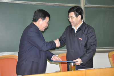 在热烈的掌声中,宋晓平副校长向安院长颁发了聘书,安东院长受聘为我校“兼职教授”和“B体育(中国)发展咨询委员会副主任委员”,宋晓平副校长为安院长佩戴了B体育平台校徽。