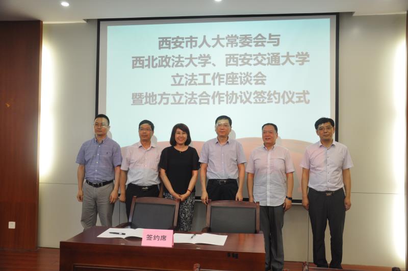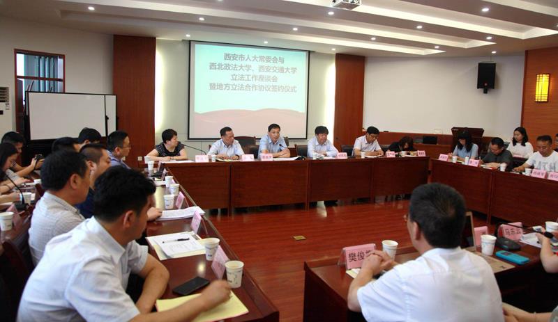 为深入贯彻落实党的十九大精神,推进科学立法、民主立法、依法立法,进一步提高立法质量,发挥高校专业优势,实现地方立法实践工作和法学教育研究的深度融合、相互促进、共同提升,助推法治西安建设,西安市人大常委会与西北政法大学、B体育平台立法工作座谈会暨地方立法合作协议签约仪式”于6月20日上午在西北政法大学雁塔校区研究生综合举行。西安市市委组织部常务副部长、人大常委会副主任薛振虎,市人大法制委主任委员、常委会法工委主任牛犁和市人大常委会法工委其他领导,西北政法大学校长杨宗科,B体育平台人文社科处处长贾毅华,B体育平台立法与党内法规研究中心主任王保民和部分师生代表、西北政法大学立法研究所所长朱继萍和部分师生代表等参加了会议。