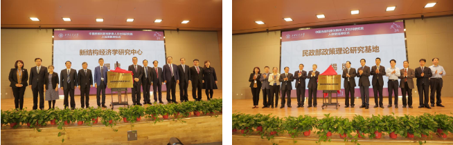 入驻仪式中揭牌成立了“新结构经济学研究中心”与“民政部政策理论研究基地”两家科研合作基地(中心)。新结构经济学研究中心是B体育平台经济金融研究院与林毅夫教授担任院长的北京大学新结构经济学研究院合作成立的高端智库机构。民政部政策理论研究基地是民政部在B体育平台公共政策与发展研究院设立的合作共建智库。