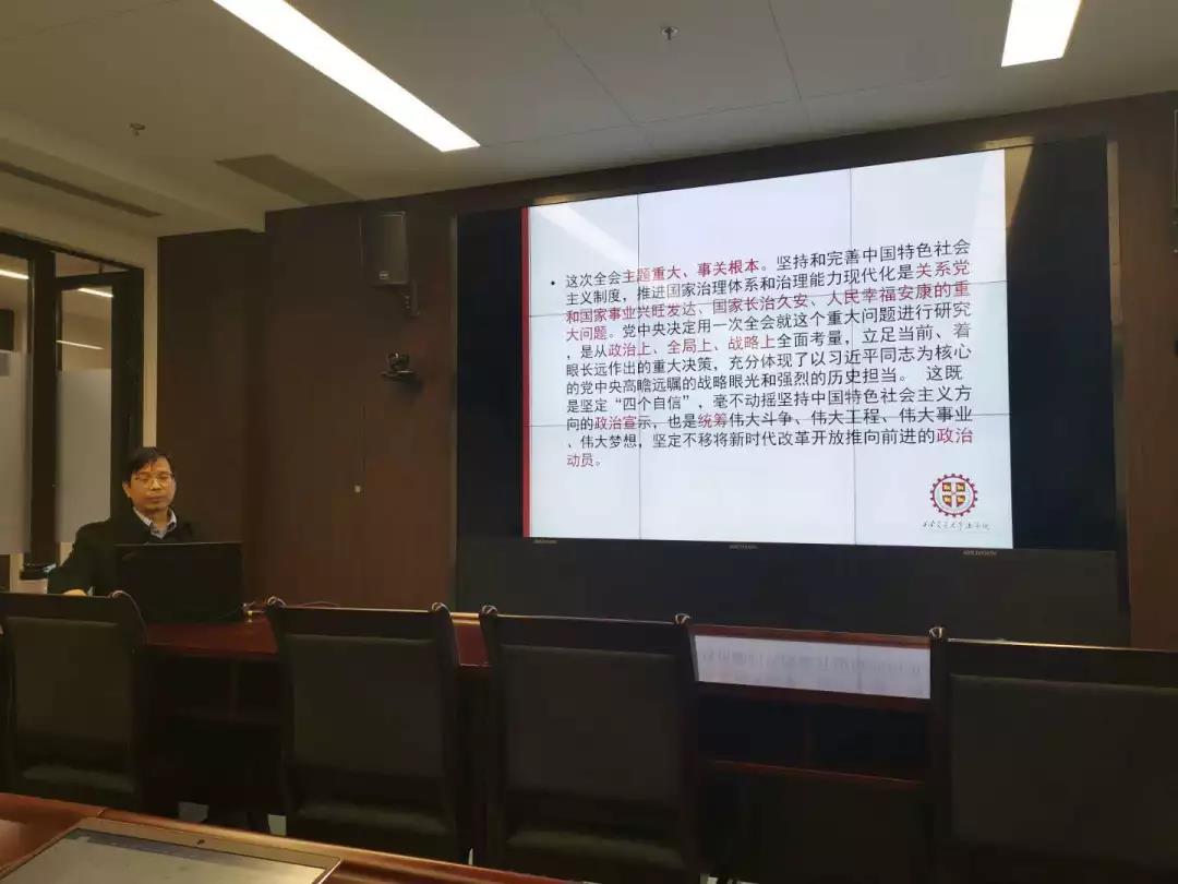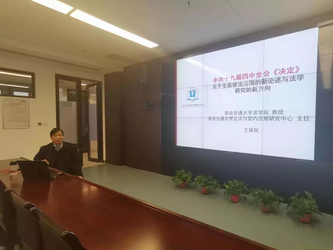 12月12日,B体育(中国)创新港系列学术讲座之“十九届四中全会关于全面依法治国的新论述与法学研究新方向”在创新港5号巨构10087教室顺利举行。B体育平台B体育(中国)党总支书记、B体育平台立法与党内法规研究中心主任王保民教授围绕中共十九届四中全会召开的基本情况和重要意义、《决定》中的高频词汇和理论亮点、《决定》关于全面依法治国的新论述、法学研究的新方向新热点等五个方面做了专题讲座。