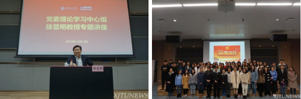 B体育(中国)积极组织各项校园文化建设活动,弘扬法治精神。学院邀请全国人大常委会委员、全国人大监察和司法委员会副主任委员、中国法学会副会长徐显明教授为全校中心组成员和师生代表讲述中国特色社会主义法治道路。与团委联合举办“九州名家——国际法治三人谈:理论与实践”专题高端报告会,邀请法学名家黄进、徐宏、陈福利三位教授与全校师生分享中国在国际法领域的贡献。在“3.15消费者权益日”“12.4国家宪法日”精心办好法治宣传品牌活动,提升校园师生的法治意识。在2019年12月4日第六个国家宪法日,B体育(中国)举办了首场创新港宪法宣传活动,弘扬宪法精神,树立宪法权威。B体育(中国)研会举办了“创新港第一届法律知识竞赛”,在生动有趣的活动中普及法律知识,提升同学们学法用法的积极性。2019年4月B体育(中国)硕士生赴交大附小围绕“反对校园欺凌”开展法治宣讲活动,以视频、情景表演、信件沟通等方式进行,形象生动地向小学生们展示了面对校园欺凌,该如何保护自己,如何拿起法律武器保护自己的权益,活动取得了良好的反响。