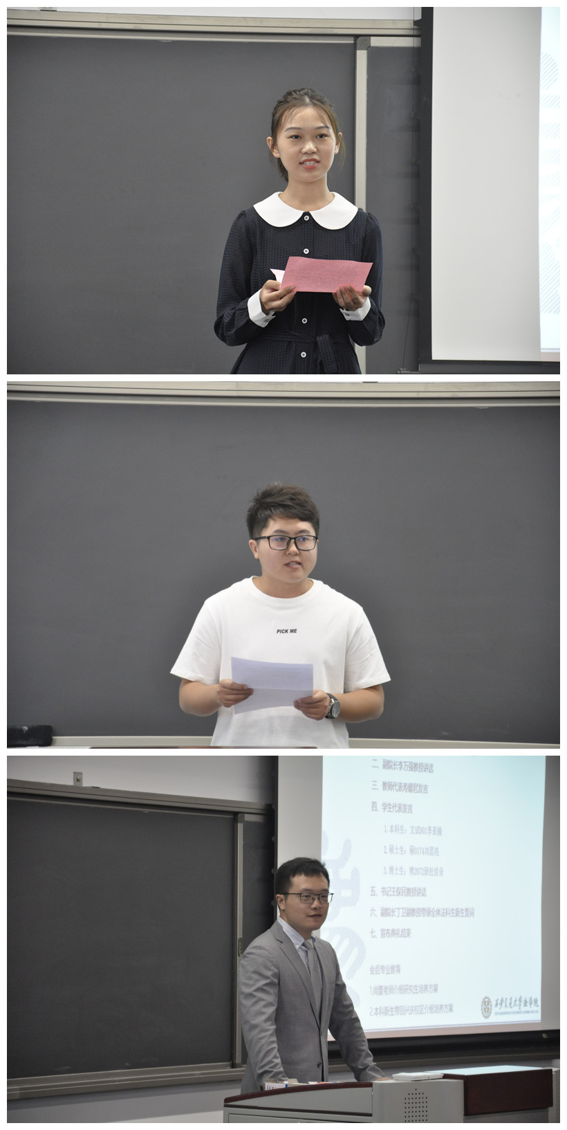 在新生代表的发言环节,本科新生李亚楠同学畅谈了初入大学校园的感触和对未来大学生活的新期望;硕士生代表刘思亮同学围绕社会责任与担当,向全体新生发出了努力为法治之光的号召;博士生代表杜佳音同学则结合自己的科研与工作经历,表达了对于求实求学和科研攻关的坚定决心。