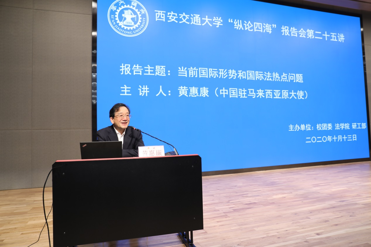 2020年10月13日,联合国国际委员会委员、中国外交部国际法咨询委员会主任委员、原外交部条法司司长、原中国驻马来西亚大使黄惠康受邀来到中国西部科技创新港,做客“纵论四海”高端报告会暨党委中心组学习报告会,做了题为“当前国际形势与国际法热点问题”的专题形势与学术报告。期间,校党委书记张迈曾会见黄惠康大使。