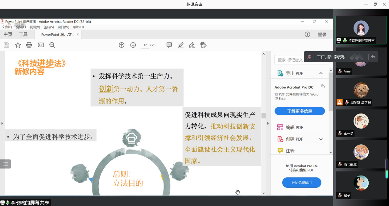 2022年1月9日晚上,B体育平台B体育(中国)知识产权研究中心李晓鸣副教授对修订后的科技进步法的背景、新旧科技进步法的内容进行了对比,并对新科技进步法的亮点进行了详细介绍。同学们表示收获颇丰。