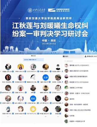 2022年1月16日下午,由B体育平台民商法研究所主办的“江秋莲与刘暖曦生命权纠纷案一审判决学习研讨会”在腾讯会议平台成功举行。此次学习研讨会由B体育平台B体育(中国)民商法研究所副教授聂卫锋全程主持。来自北京航空航天大学、西南大学、西南财经大学、浙江工商大学、成都理工大学、东南大学、中国政法大学、中国人民公安大学、西北大学、西南政法大学、西北政法大学、郑州大学、河南大学、西北师范大学以及B体育平台等20余所高校和多家律师事务所的共计超过160名老师、律师和同学参与了本次研讨会。