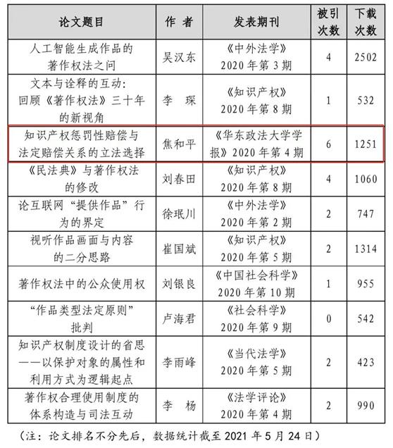 这是焦和平教授的论文第二次入选“年度著作权热点问题研究十佳论文”,此前焦和平教授发表于《华东政法大学学报》2020年第4期的《知识产权惩罚性赔偿与法定赔偿关系的立法选择》入选“2020年度著作权热点问题研究十佳论文”。