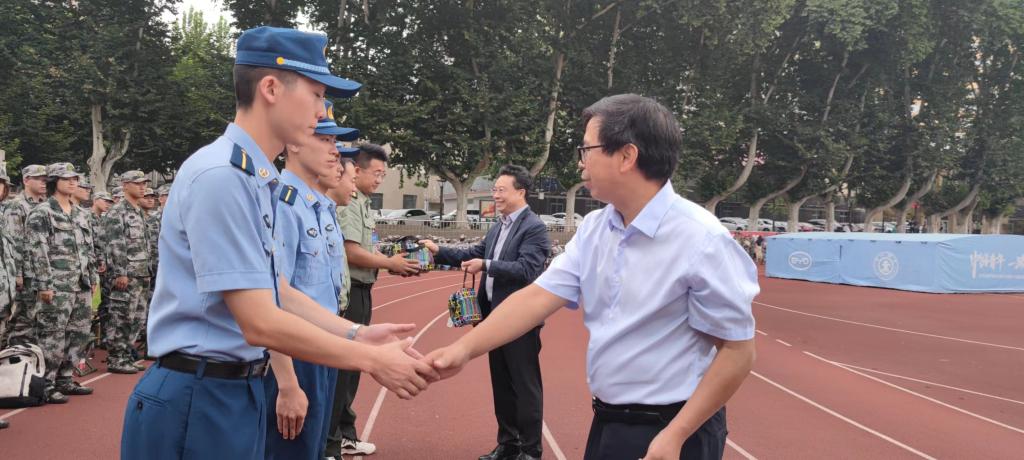 之后,单文华院长和王保民书记一起为教官、指导员和同学们送上“慰问大礼包”,逐一将慰问品送到教官、指导员和同学们的手中,给炎炎夏日带来缕缕清凉。