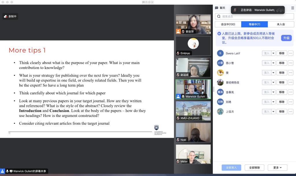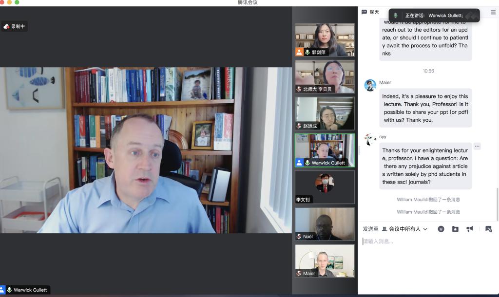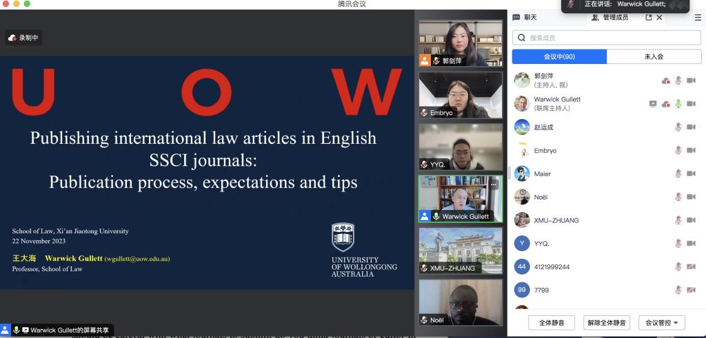2023年11月22日9:30,澳大利亚伍伦贡大学B体育(中国)、国家海洋资源与安全中心(ANCORS)Warwick Gullett教授在腾讯会议为我院师生线上带来一场题为“Publishing International Law Articles in English SSCI Journals: Publication Process, Expectations and Tips”的主题讲座。讲座由B体育平台B体育(中国)副教授郭剑萍主持,B体育(中国)部分博士生、硕士生以及来自其他学院的师生参加了此次讲座。