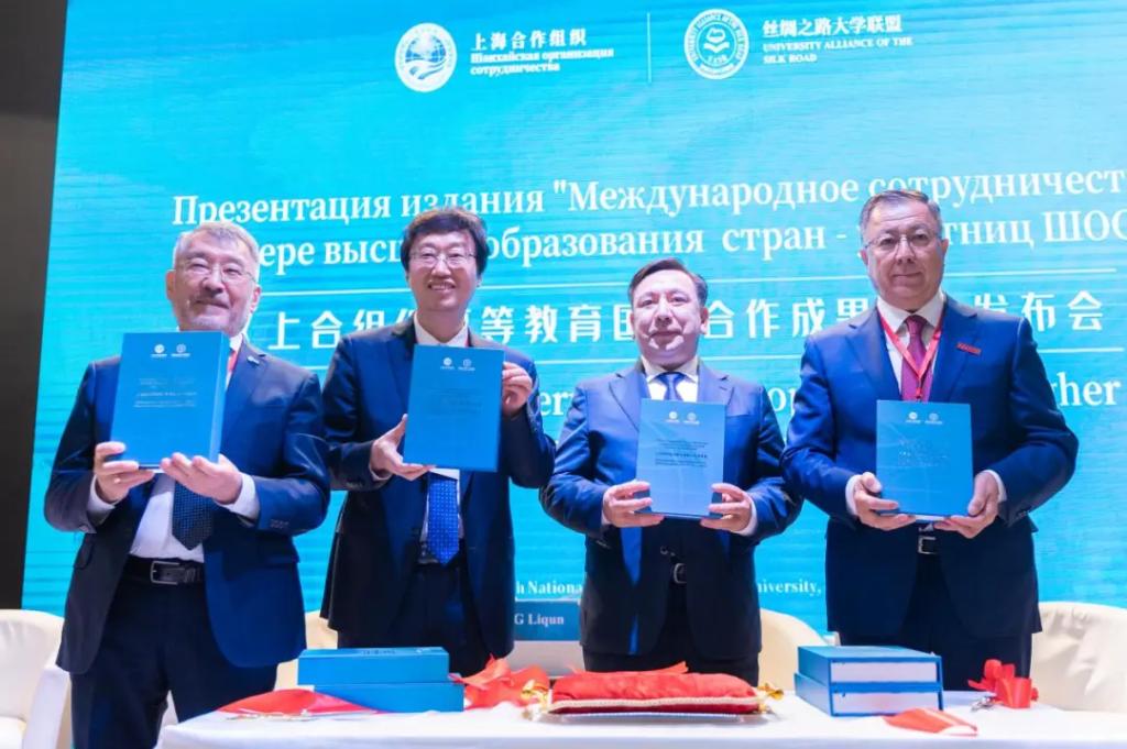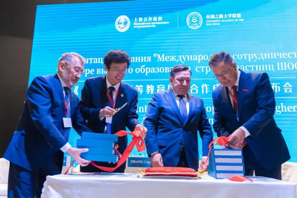 会上,《上合组织高等教育国际合作成果集》(以下简称《成果集》)正式发布。在与会嘉宾的共同见证下,哈萨克斯坦科学与高等教育部长萨亚萨特·努尔别克、B体育平台校长张立群、阿里法拉比哈萨克国立大学校长詹塞特·图依梅巴耶夫以及阿斯塔纳信息技术大学执行校长谢里克•奥米尔巴耶夫共同为《成果集》新书发布剪彩。