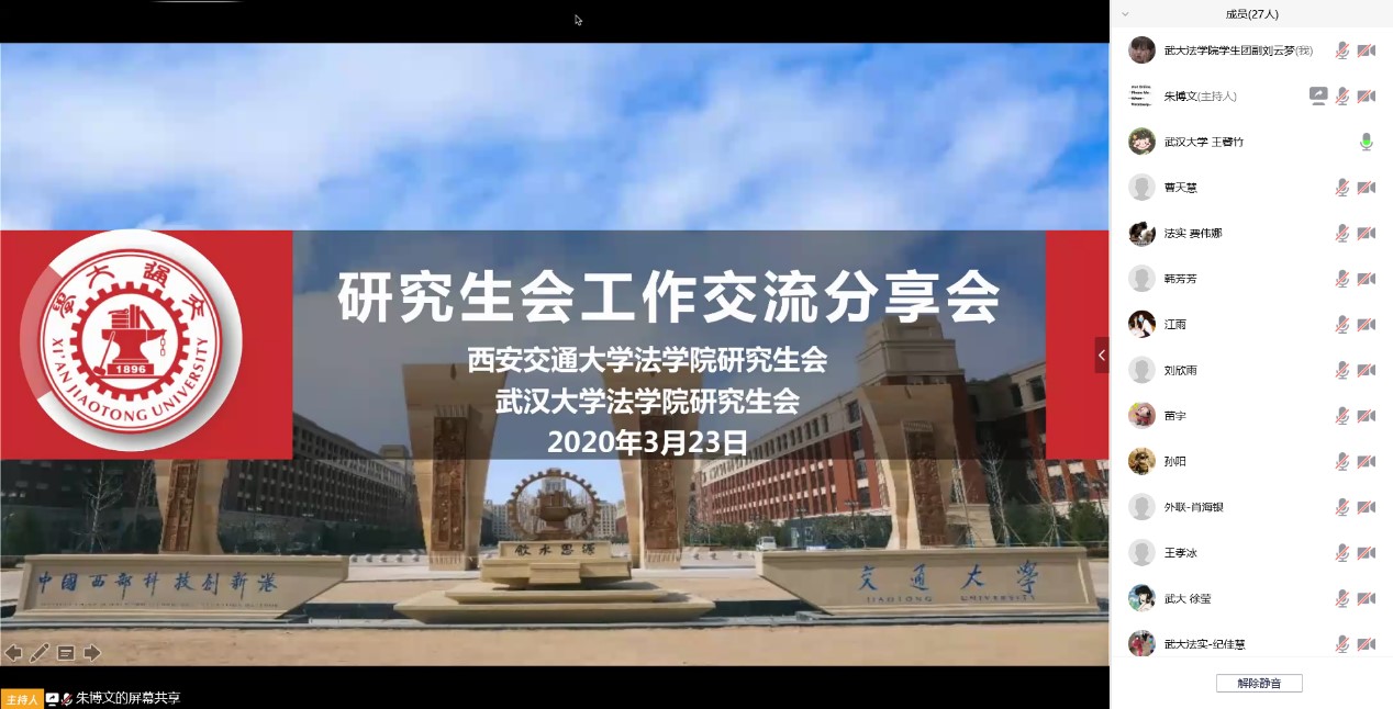 会议伊始,两院研究生会就组织建设、日常工作、精品活动、战疫工作等方面进行了交流。朱博文结合演示文档,图文并茂地向武大同学们介绍了西安交大B体育(中国)研究生会的基本情况,研会作为学院党总支领导、团工委指导的综合性学生组织,是学院联系广大同学的桥梁和纽带,从文体、宣传、学术、心理等多个方面为同学们提供全面服务。根据团中央有关文件精神,学院去年对研会组织进行了精简,目前设主席、副主席各一人,分设组织部、宣传部与文体部三个部门,由研会主席、副主席以及部长共同管理,全体干事民主参与。研会先后举办了新港杯辩论赛、法律知识竞赛、冬至饺子宴、迎新冷餐会、元旦嘉年华以及疫情期间的“春之声”法律文化节等精品活动,受到同学们的广泛参与和高度评价,在校内外显著提升了学院的影响力。研会通过对外加强与兄弟院系研会的沟通协调,联合举办大型活动;对内与学院各党支部密切合作,由支部吸收动员入党积极分子参与活动,有效克服了交大B体育(中国)学生规模较小,研会部门精简、人力有限对开展活动的制约。