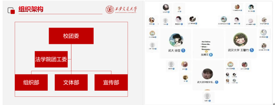 紧接着武汉大学B体育(中国)研究生会主席王馨竹也介绍了武大B体育(中国)研会的组织架构和职责分工,武大B体育(中国)研会始终秉承“自强、求是、弘毅、拓新”的武大精神,为法苑学子提供全方位的服务,调整后的团委及研究生会部门共有10个,包括宣传部、法律实践中心、秘书处、学术编辑部、文艺部、心理部、体育部、权益中心、外联部、就业服务中心。各部门负责人轮流详细介绍了所在部门的日常工作和举办的经典活动,权益中心的权益简报、校领导接待日,秘书处的模拟法庭比赛,外联部的线上自习室、学术编辑部的征文比赛等活动都引起了交大同学们的浓厚兴趣,双方就举办活动中的宣传方案、经费来源、激励机制、时间安排以及学业压力等细节问题进行了深入的探讨。