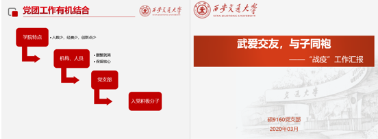 随后的党团工作交流环节,两院有关负责同学分别介绍了党团组织在抗疫期间的主要工作。交大B体育(中国)硕9160党支部书记孙阳表示,B体育(中国)各支部积极响应习近平总书记重要指示,落实党中央国务院决策部署,对标学校、学院防控要求;加强防疫宣传教育,引导学生带头守法;畅通信息报送渠道,保障日报制度运行;分享线上学习资源,配合做好线上授课筹备工作,号召同学在导师指导下深入研究疫情相关法律问题;倡导党员服务社区,组织党员捐款捐物。武大B体育(中国)团委学生副书记刘云梦表示,自疫情发生以来,学院迅速成立以党委统一领导、统一指挥的疫情防疫工作小组,形成了党总支、党支部、党员个人三级联动的有力防控网络,从理论学习、思想引领、基层服务多领域开展抗疫工作。团支部积极响应,组织学习“青年大学习”团课,开展主题团日活动,鼓励团员青年积极投身防疫工作,发挥团员的生力军作用。
