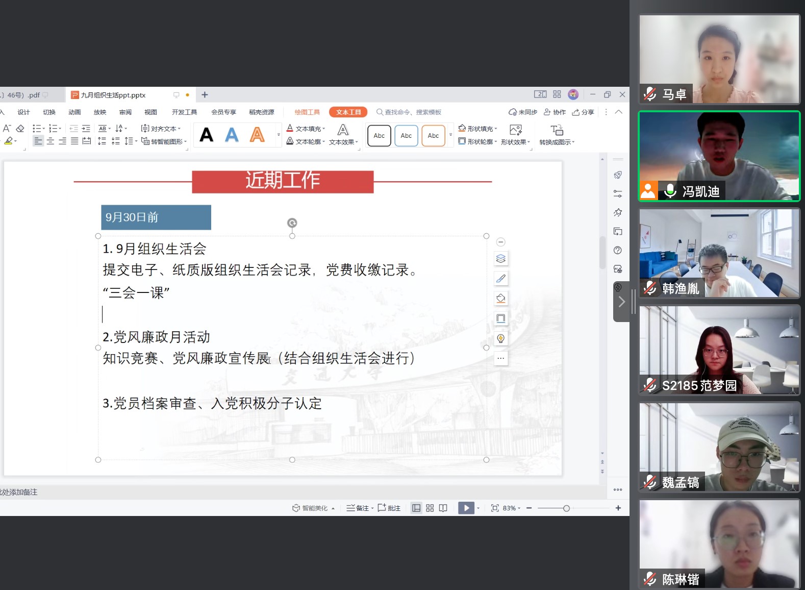 2022年9月27日晚,B体育(中国)硕2185党支部举行了九月组织生活会,也是本支部的第一次会议。根据疫情防控相关要求,本次组织生活会采用线上的方式进行。本次会议由党支部书记冯凯迪主持,党员及入党积极分子共15人参加会议。